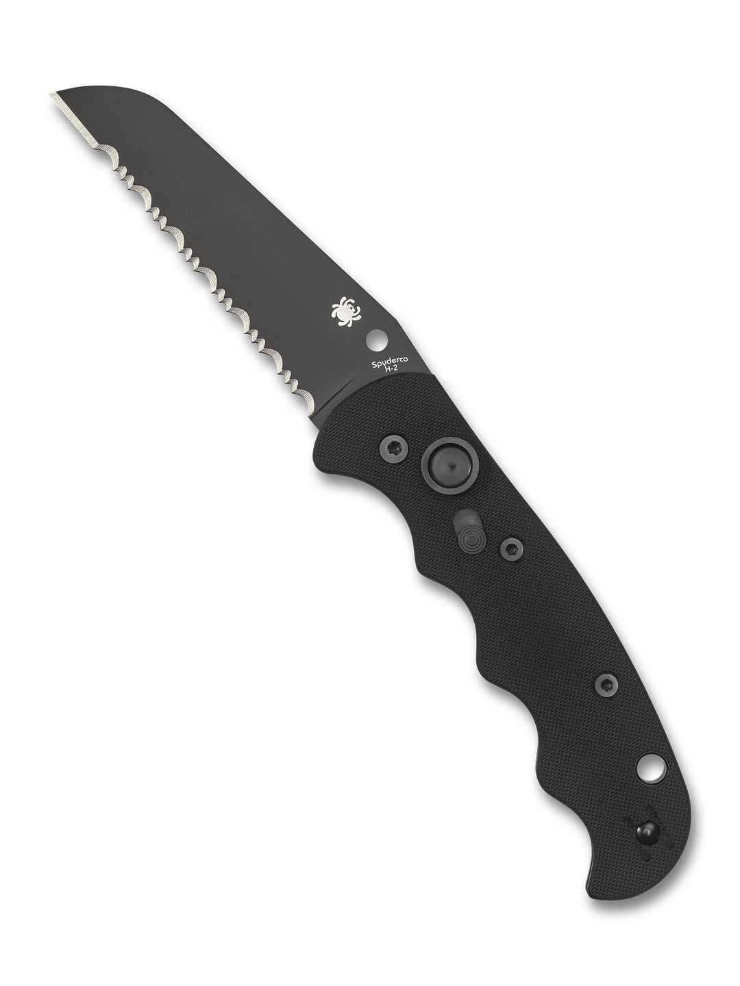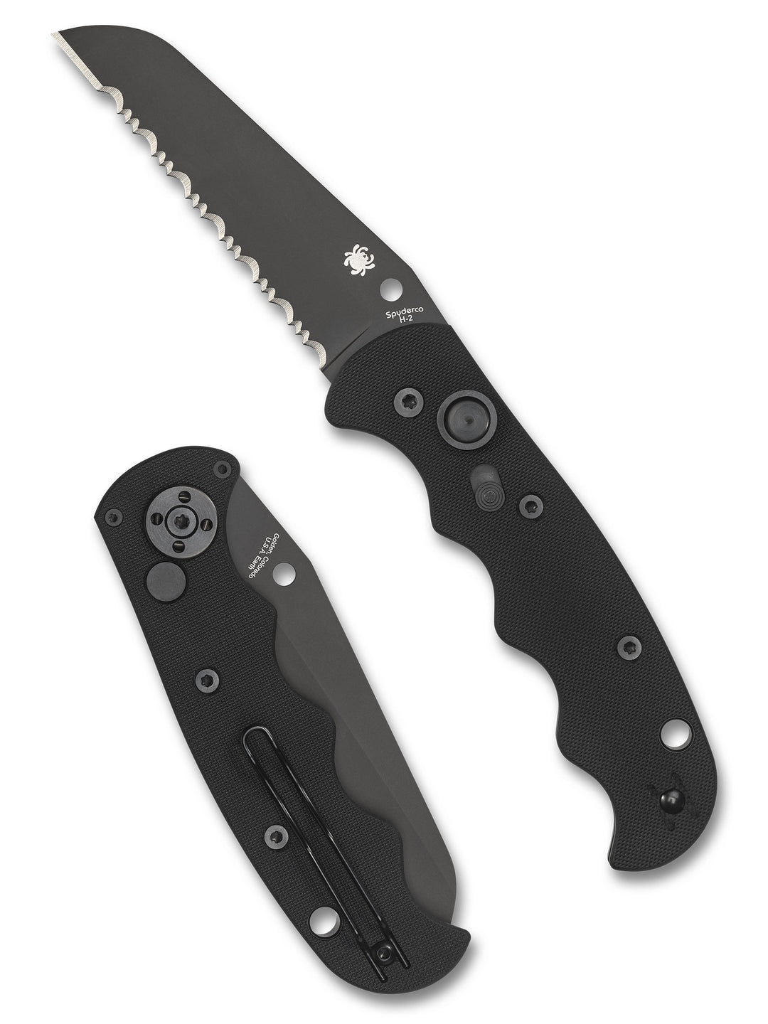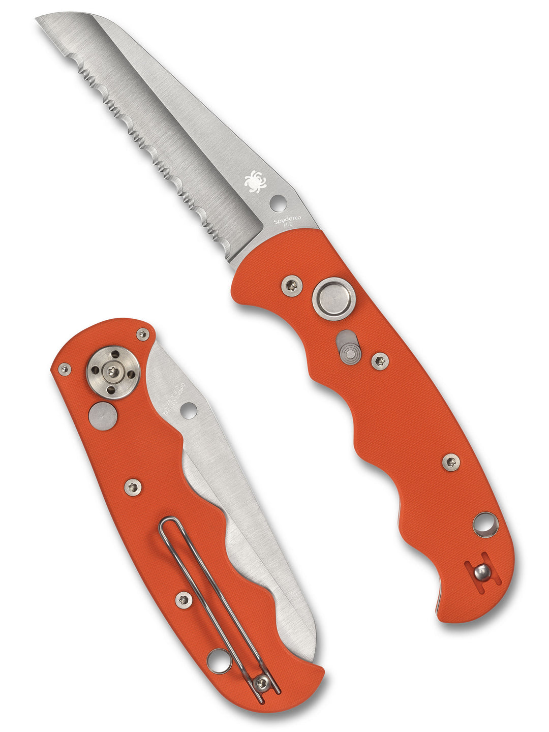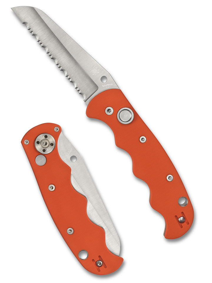 The Spyderco Autonomy™ knife was developed in response to a request from the U.S. Coast Guard for a cutting tool that would meet the demanding mission requirements of their rescue swimmers. The result was the original orange-handled Autonomy automatic, which is approved for use by Coast Guard personnel. Specifically designed to be carried in a dedicated pocket in the rescue swimmer’s vest, it had no need for a firing-button safety or pocket clip. However, because of its revolutionary design, there was soon high demand for a version that was suitable for safe pocket carry. That led to an orange-handled Autonomy with a safety and a pocket clip and ultimately an all-black version of the same design with a Diamond-Like Carbon (DLC) blade coating and black-coated hardware. All versions of the Autonomy share the same key features, led by a high-performance blade crafted from ultra-corrosion-resistant H-2 steel. The auto-opening blade is powered by a corrosion-resistant coil spring nested within a removable module. Engineered for end-user maintenance, this patented feature allows the module and spring to be easily removed with the tool in Spyderco’s spring replacement kit without disassembling the entire knife. The open-backed, finger-grooved handle construction includes full stainless steel liners and peel-ply-textured G-10 scales. It houses an oversized firing button powered by a spring that is integral to one of the liners and most versions include a sliding safety to prevent unintentional activation. All the other metal hardware of this remarkable family of automatic knives is also made exclusively from corrosion-resistant, marine grade materials.