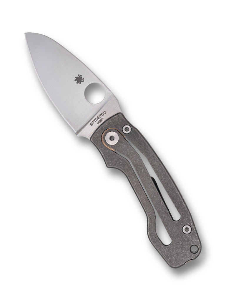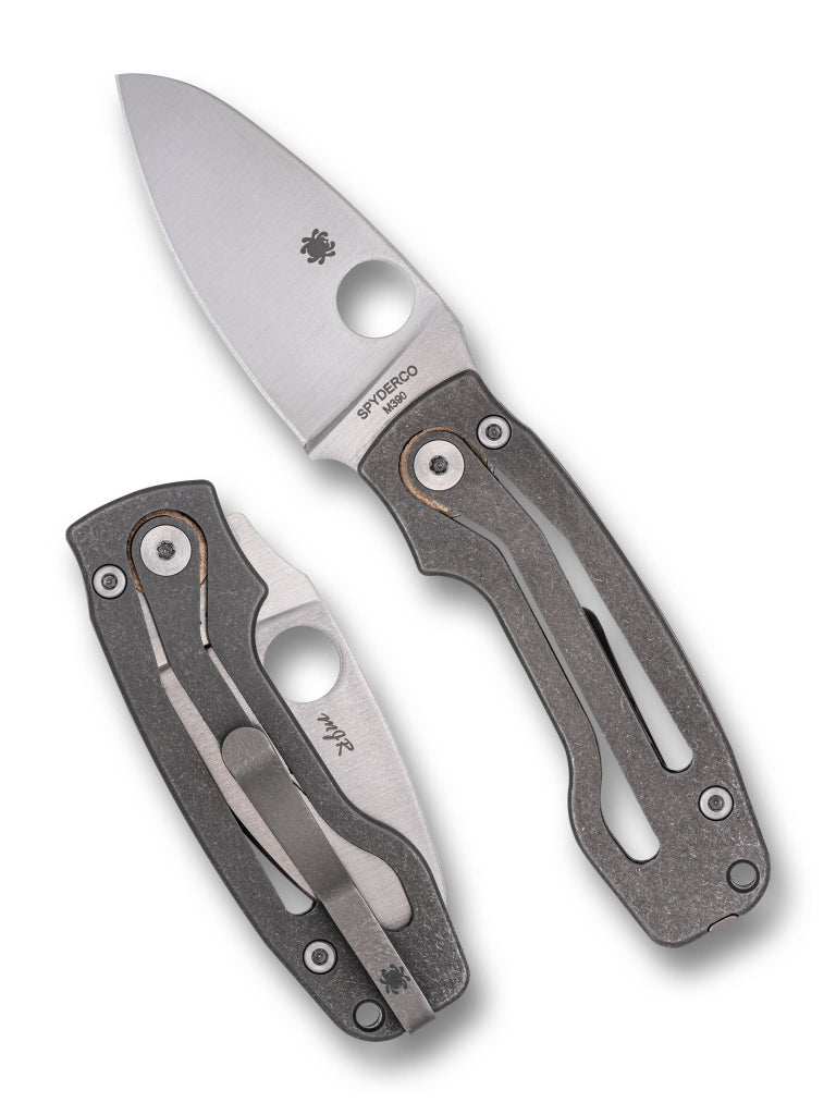 British knifemaker Mike Read specializes in crafting state-of-the-art non-locking folding knives. His first Spyderco collaboration, the PITS™ (short for “Pie in the Sky”—Read’s forum name on British knife forums), redefined the form of this genre. The PITS 2 takes that evolution a step further with a truly unique non-locking mechanism that consists of two integral spring arms machined into the handle scales. The forward end of these arms, which supports the blade pivot, flexes as the blade is opened to provide pressure for its notched-joint mechanism to bear against the stop pin. Meticulously machined from solid 6AL-4V titanium, the matte-finished handle scales are paired with a full-flat-ground, satin-finished blade crafted from Böhler-Uddeholm’s M390 particle metallurgy stainless steel. A remarkable expression of Spyderco’s SLIPIT™ concept, the PITS 2’s symmetrical design is complemented by a fully accessible Trademark Round Hole in the blade and a reversible tip-up pocket clip to make every aspect of its carry and operation completely ambidextrous.